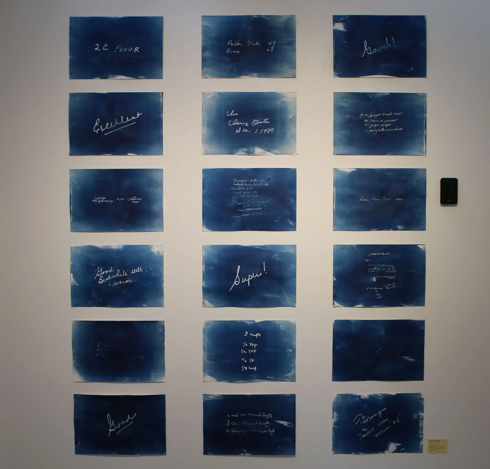 Digital negative scan of traced margin notes from found cookbooks, cyanotype emulsion, watercolour paper. 12” x 18” each.