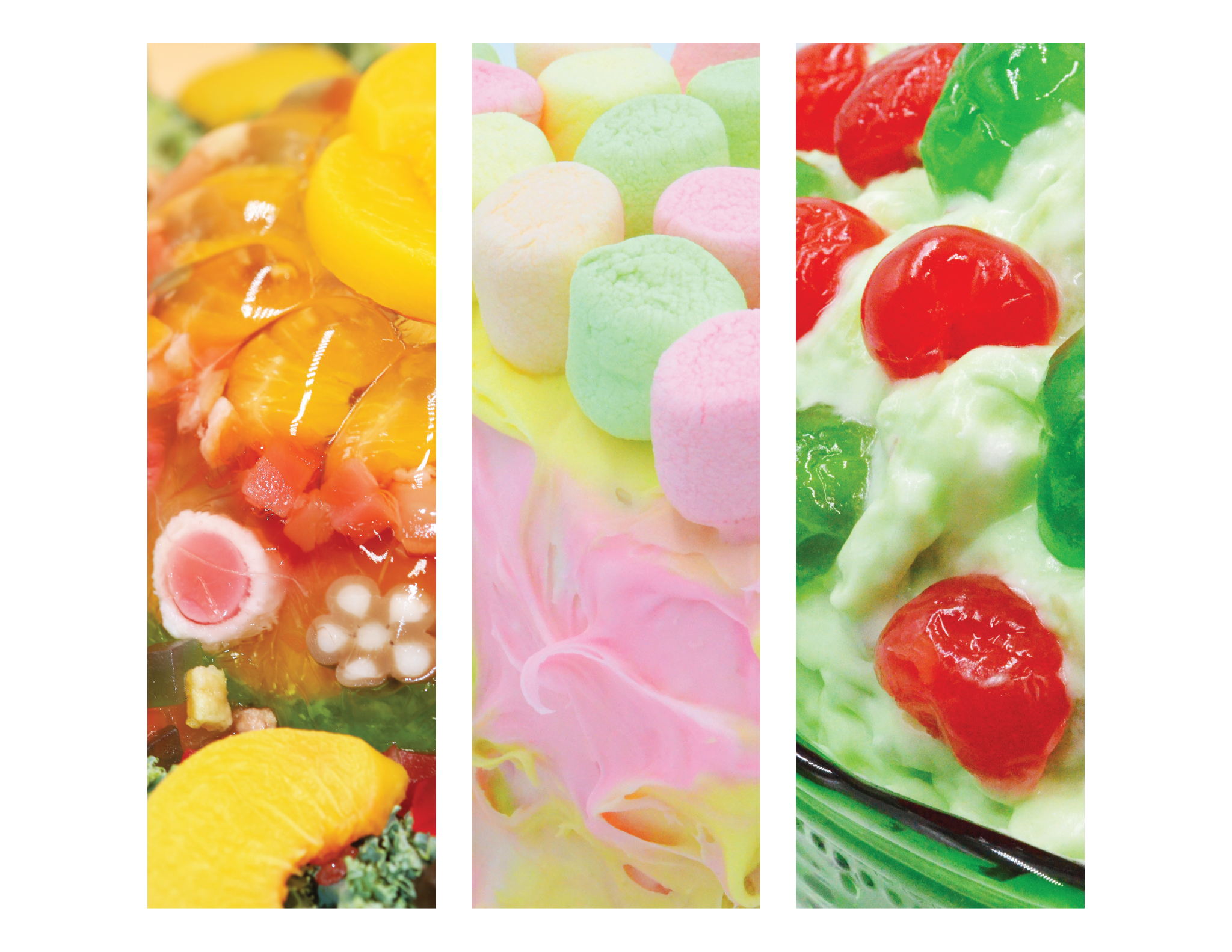 Pigment prints depicting macro details of original and found recipe results. 24” x 72” each. 2025.